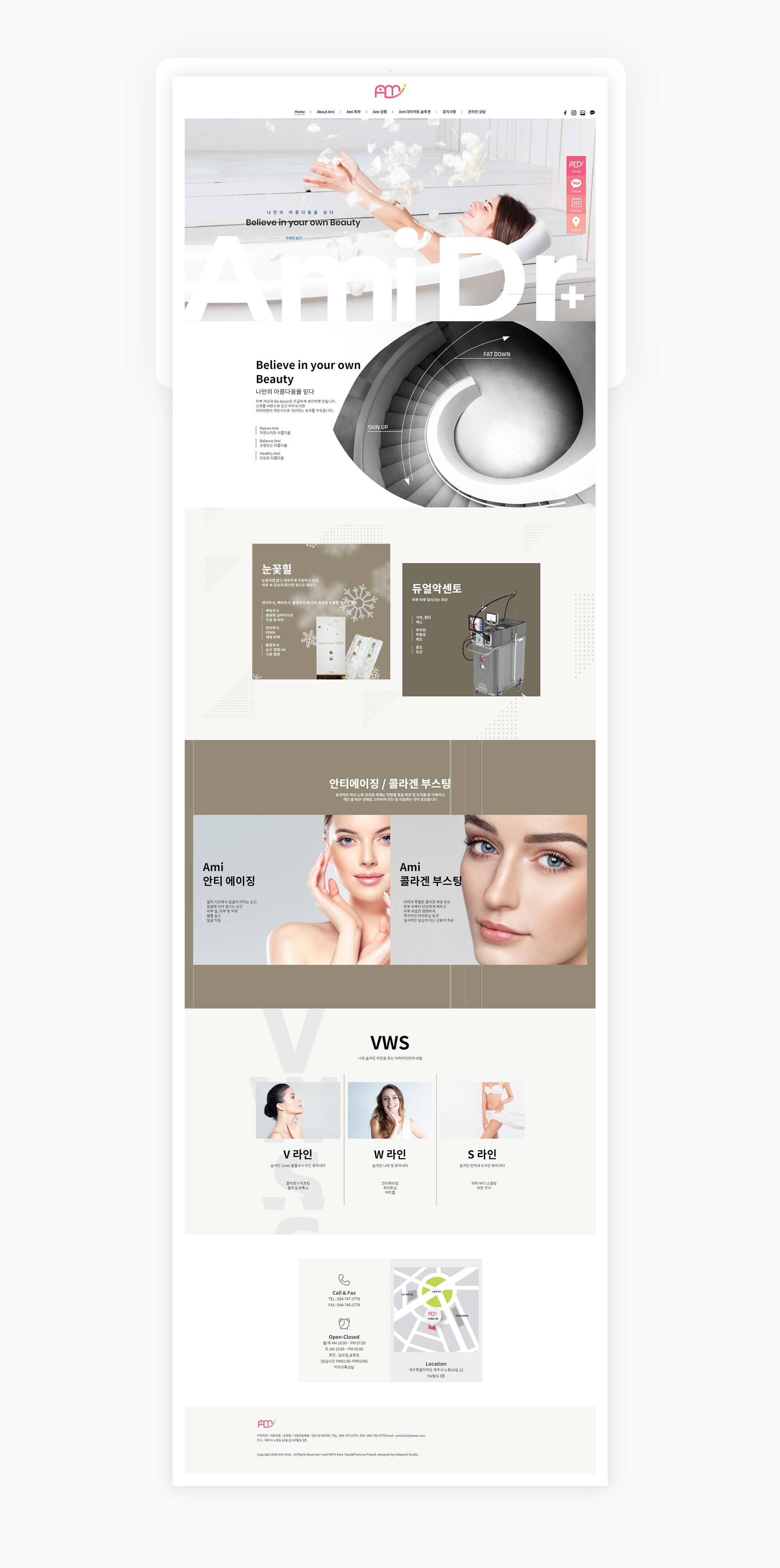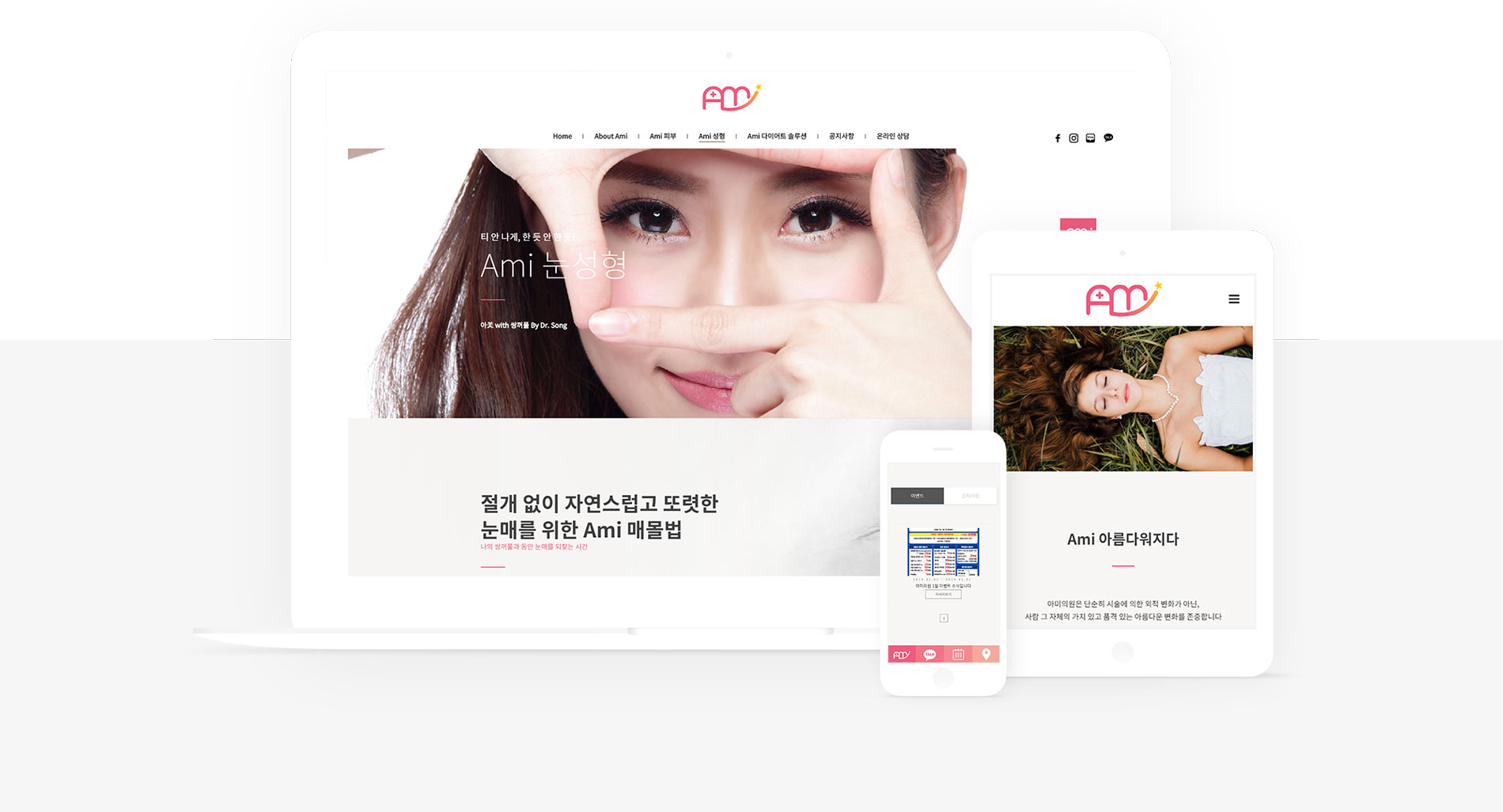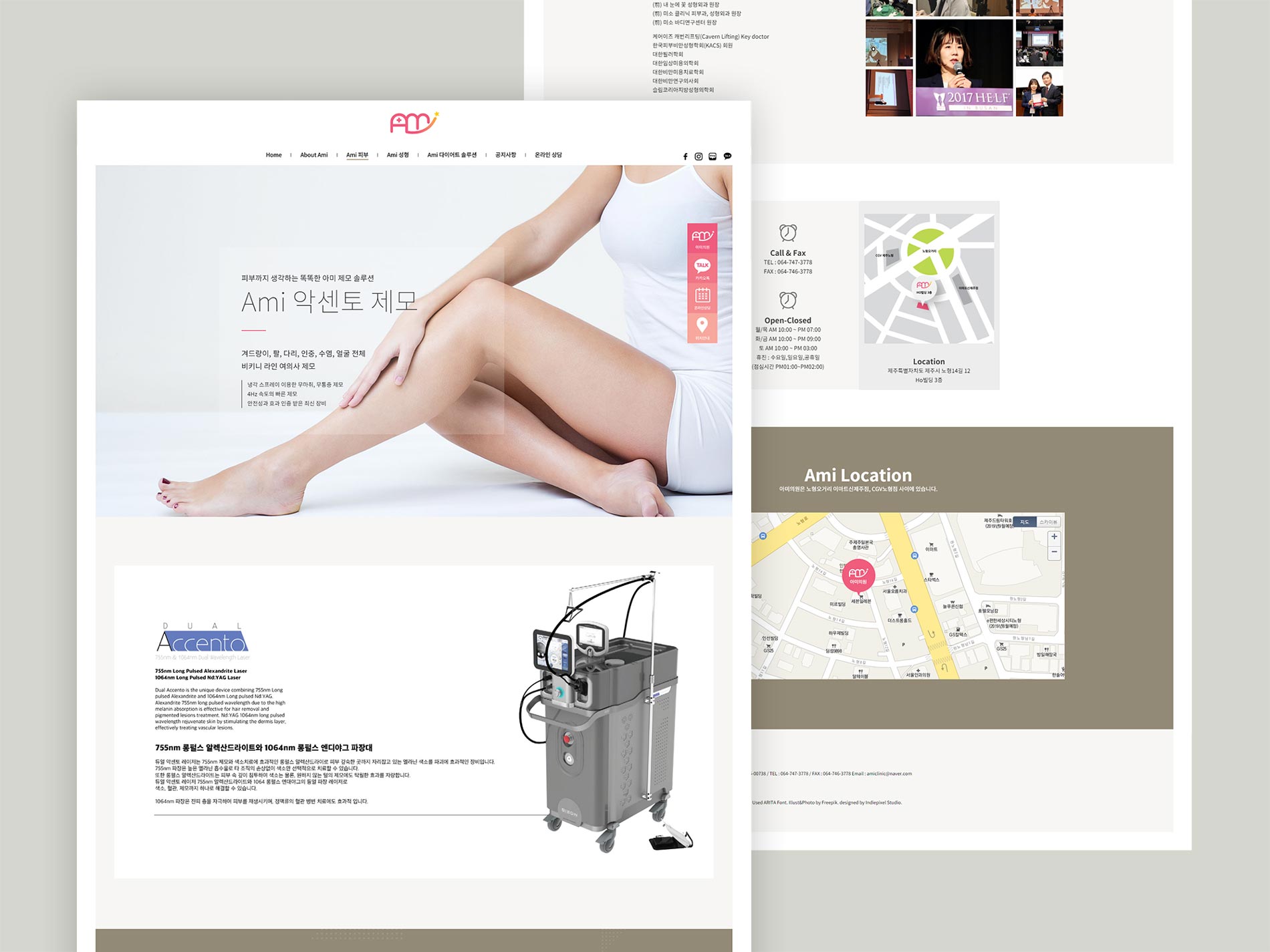 제주시에 위치한 피부 클리닉 전문병원 아미의원의 홈페이지를 제작했습니다. 100% 반응형웹으로 제작된 홈페이지로, 매거진을 보는듯한 카다로그 스타일 디자인을 채용한 홈페이지 입니다. 맞춤형 일러스트와 산뜻한 느낌의 컬러배치, 고객들이 쉽게 문의할 수있도록 모바일 하단에 바로가기 메뉴버튼을 고정하여 접근 편의성에 포커스를 맞춘 병원 홈페이지 입니다.