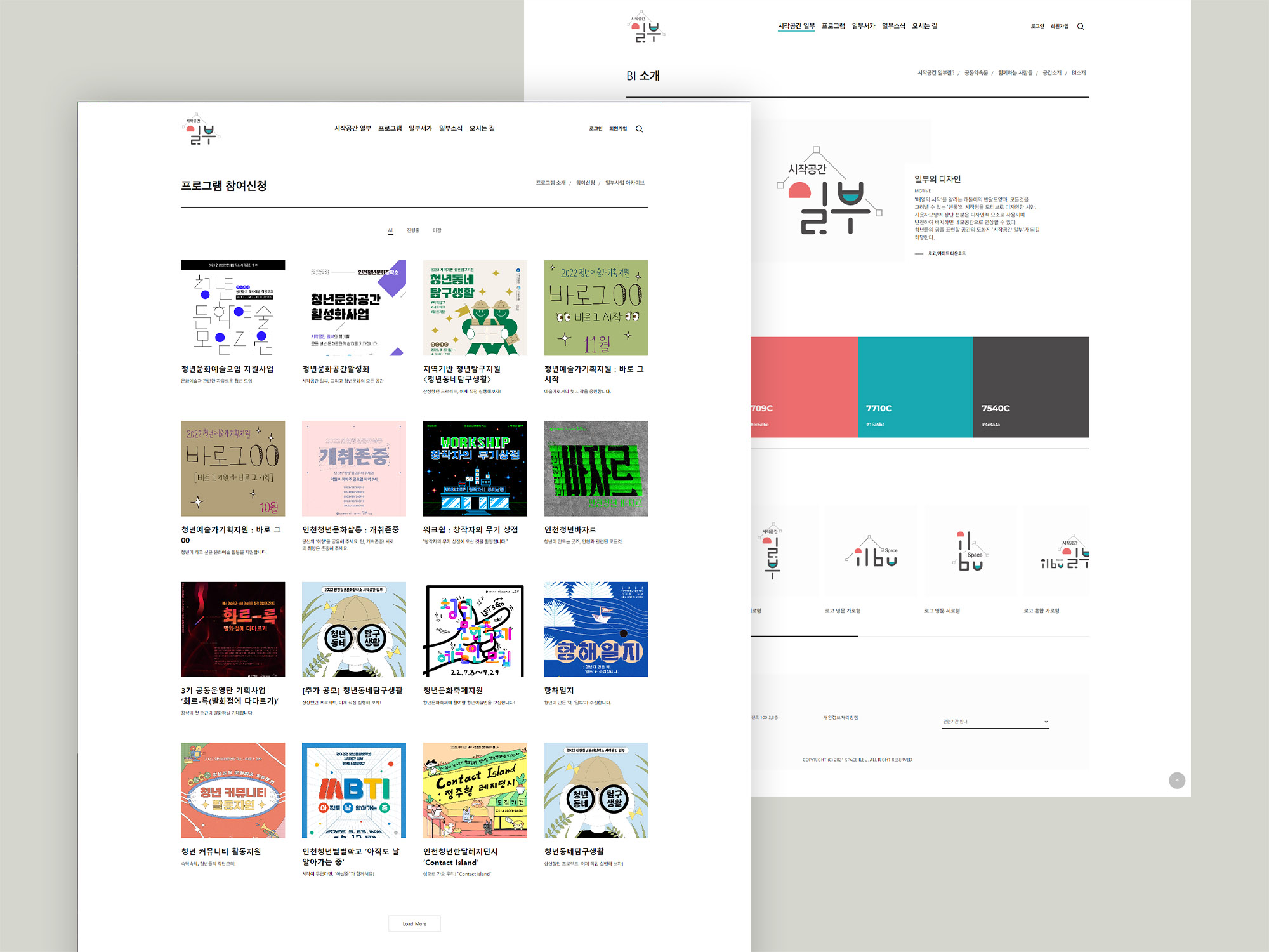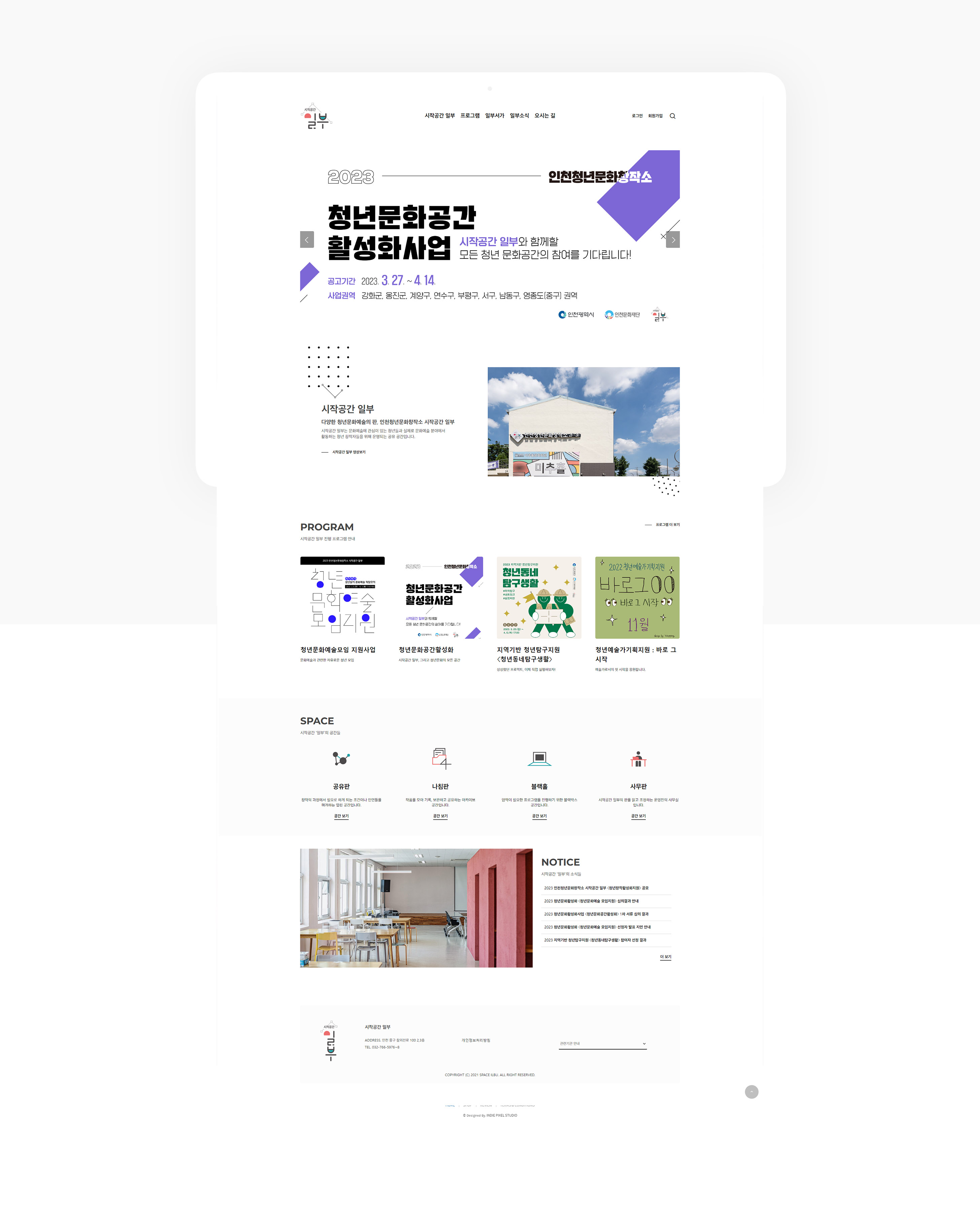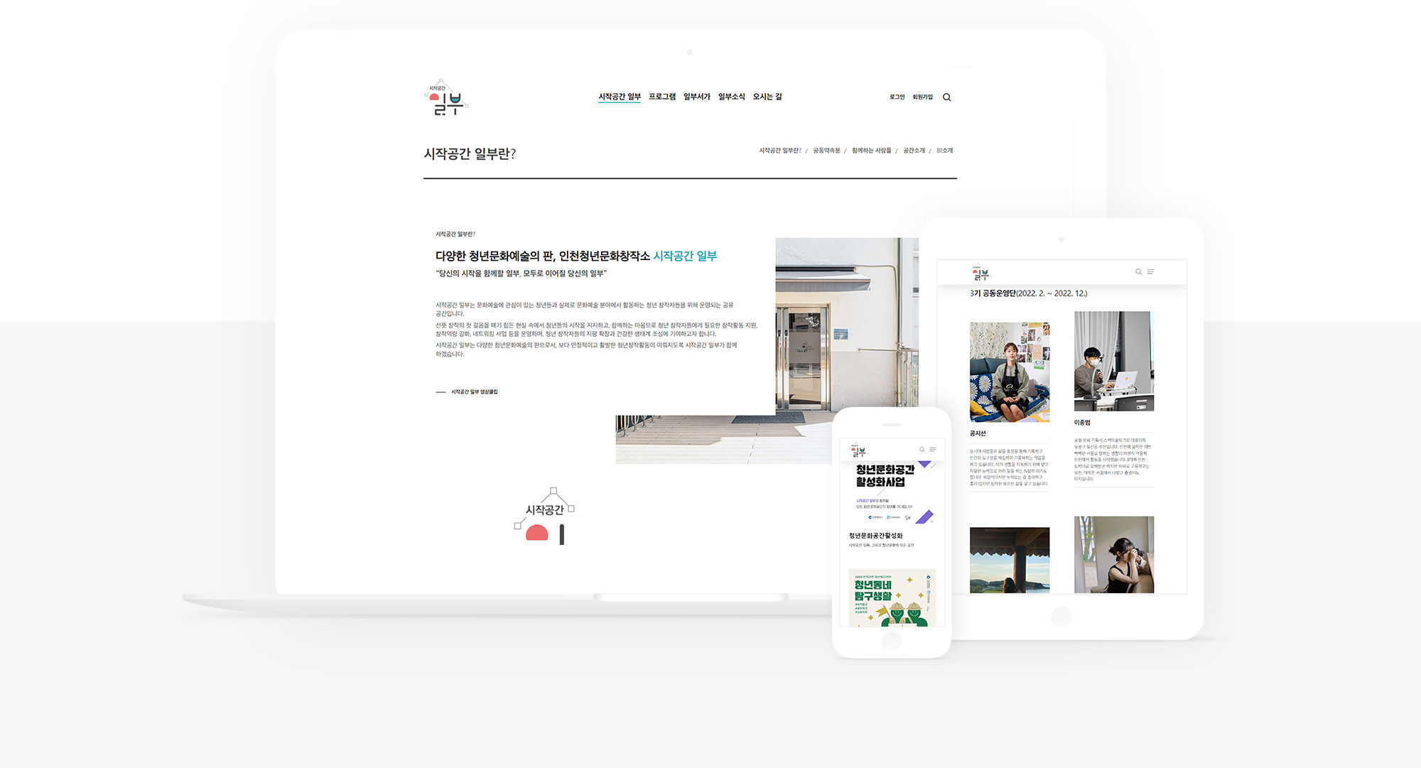 인천문화재단 산화 청년문화사업을 진행하는 시작공간 일부는 문화예술에 관심이 있는 청년들과 실제로 문화예술 분야에서 활동하는 청년 창작자들을 위해 운영되는 공유 공간입니다. 해당 공간의 타켓에 적합하도록 간결하고 복잡하지 않은 동선, 홈페이지 자체보단 재단이 진행하는 각종 사업이 돋보일 수 있는 디자인으로 꾸며진 홈페이지 입니다.