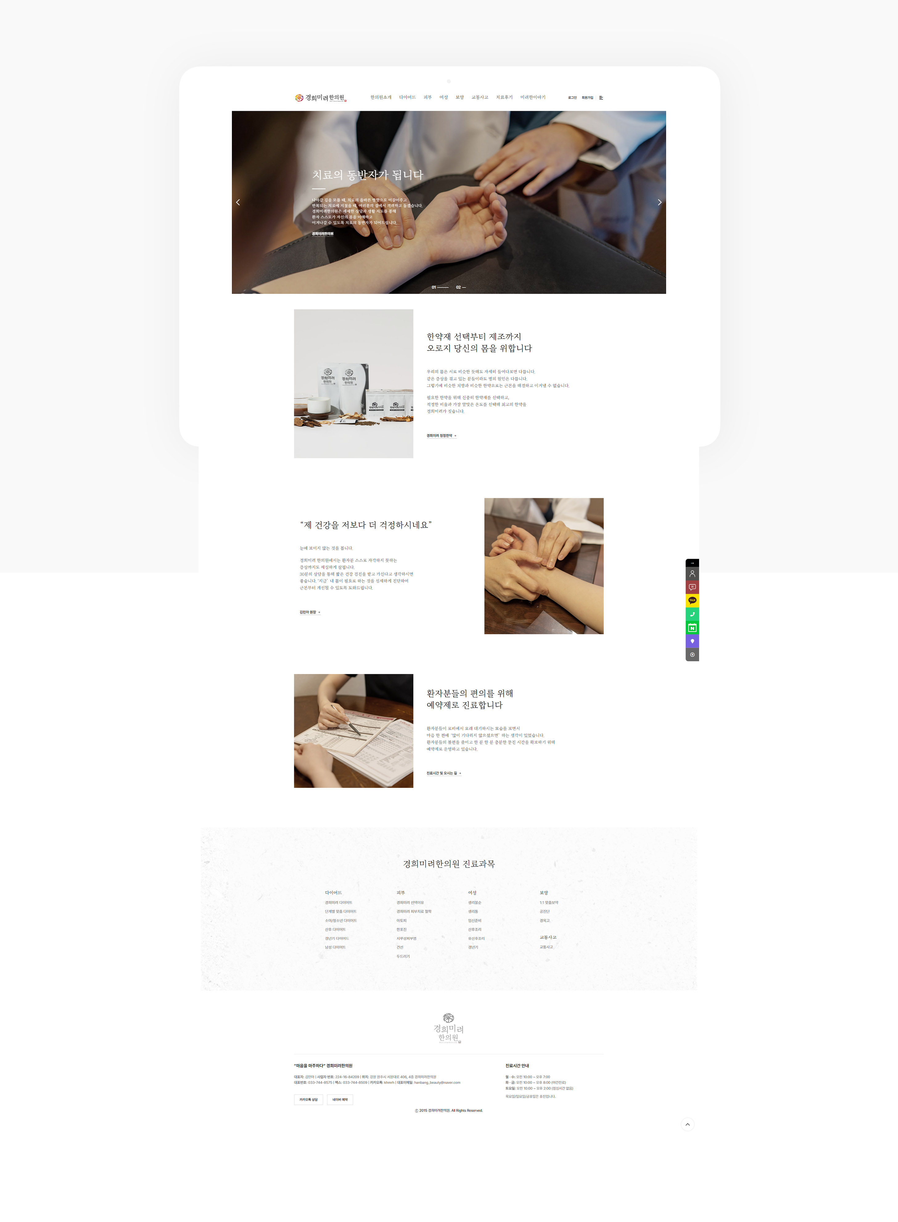 강원도 원주에서 3대를 이어온 전통의 경희미려한의원 홈페이지를 리뉴얼 제작하였습니다. 클라이언트의 요구에 따라 진부하고 식상한 기존의 홈페이지 내용을 탈피하여 스토리텔링 컨셉의 디자인으로 제작된 한의원 홈페이지 입니다.