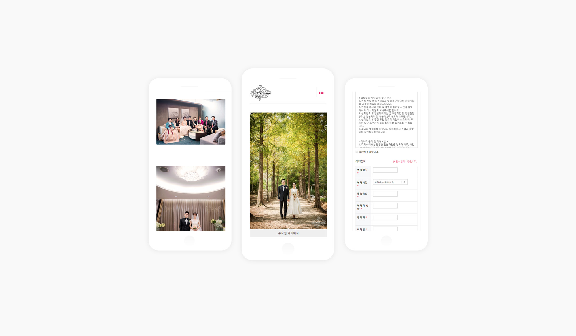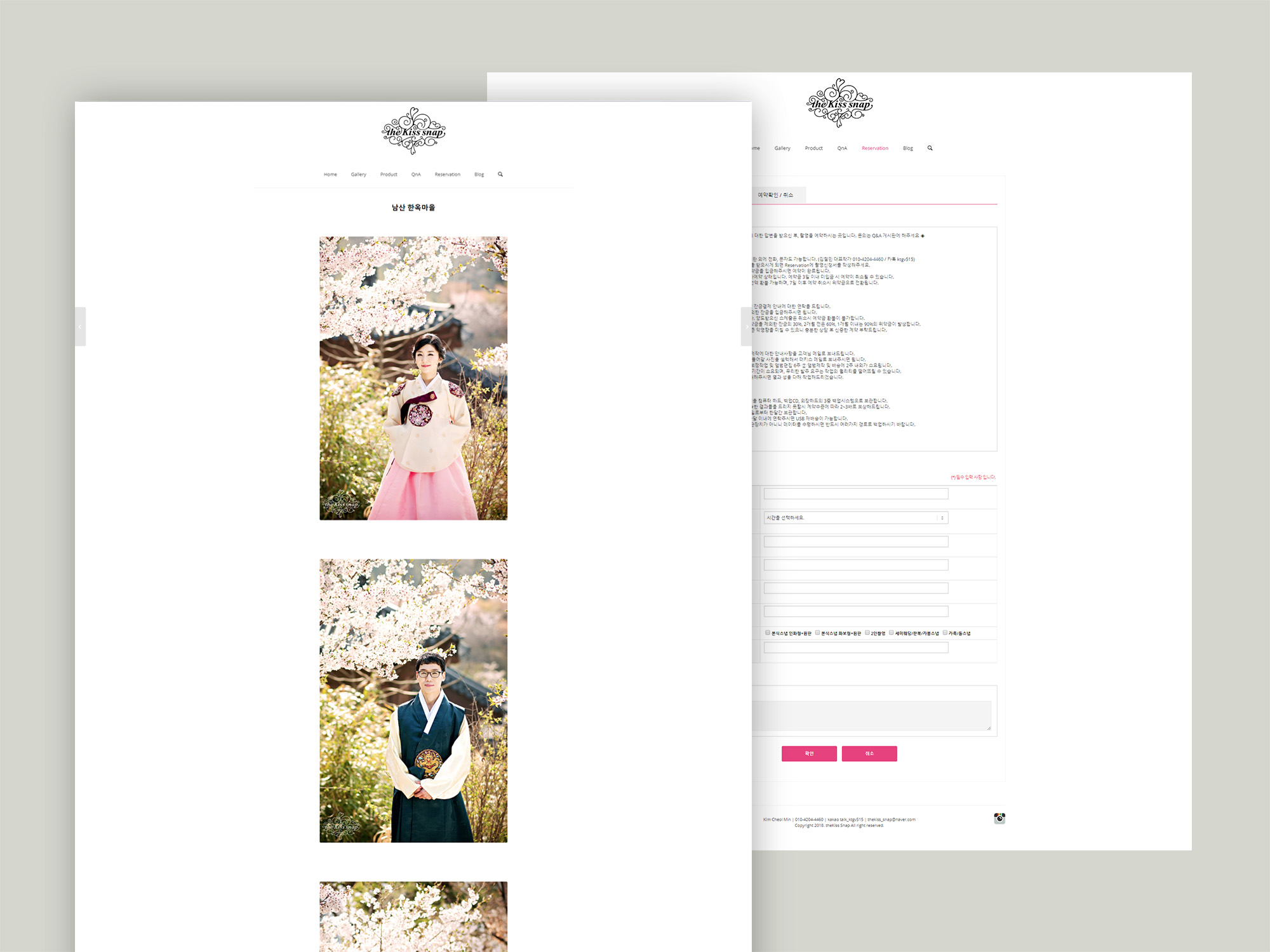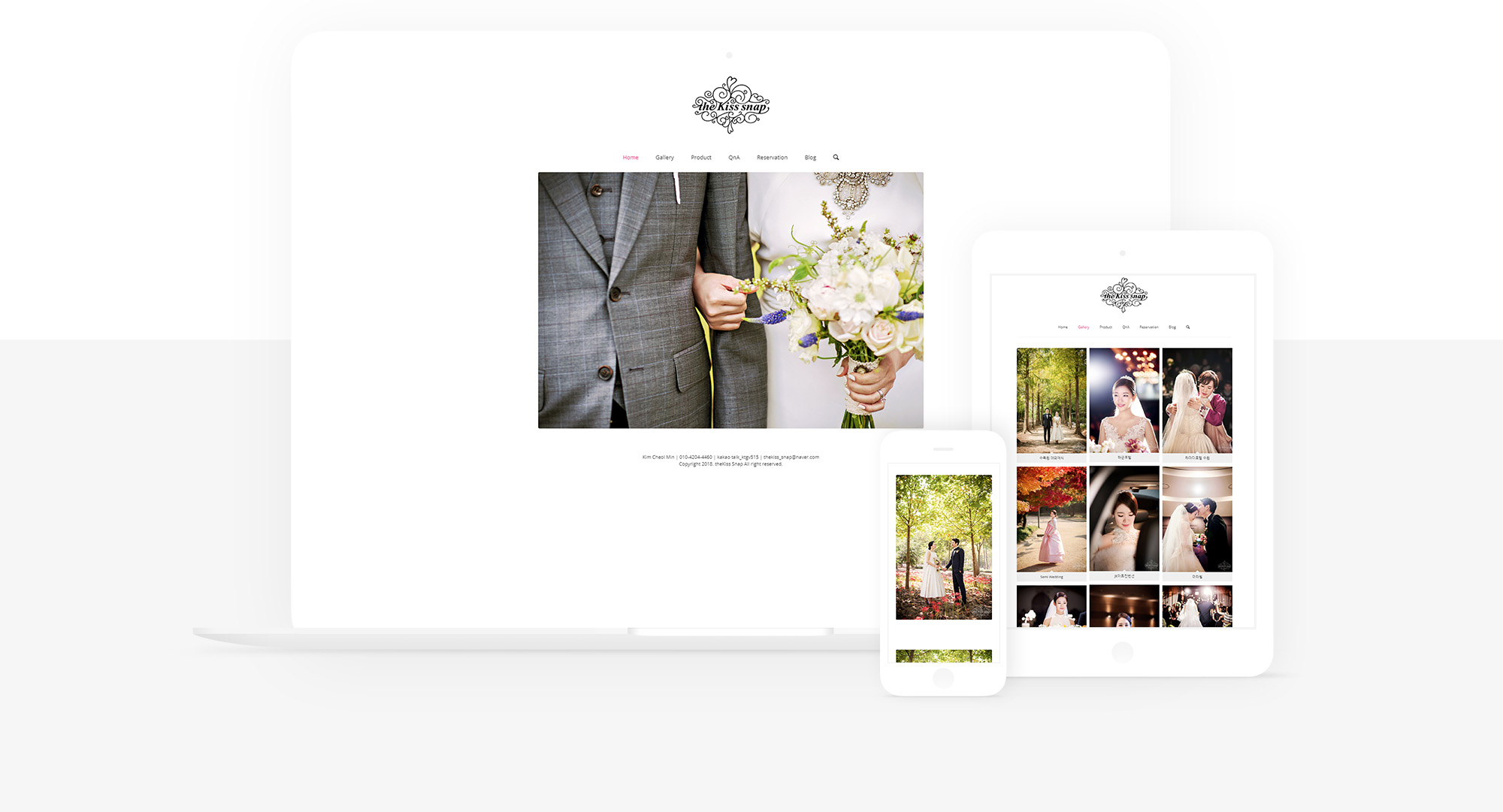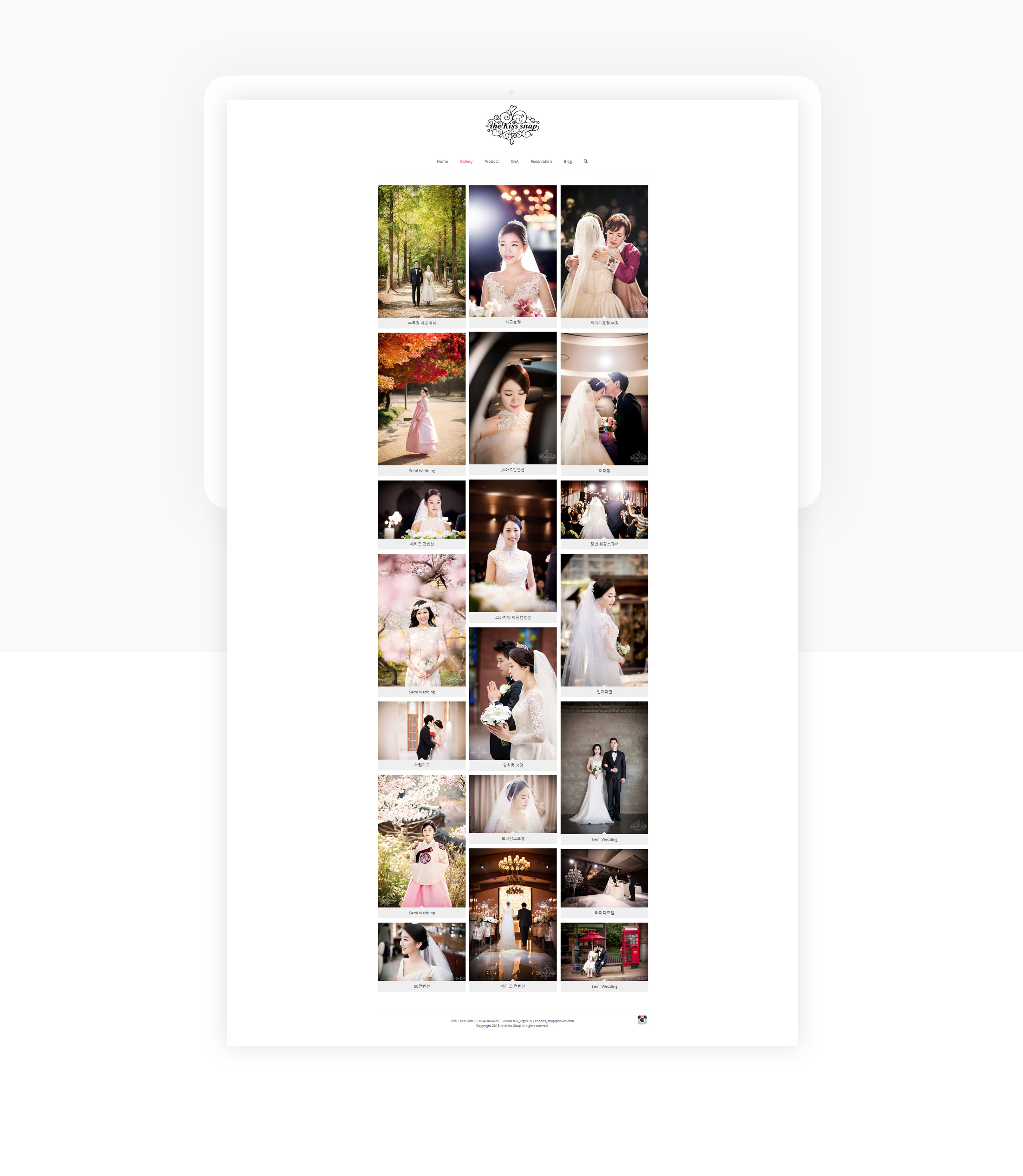 웨딩스냅, 데이트스냅 전문 스튜디오 더키스 스냅의 홈페이지를 구축했습니다. 클라이언트께서 요청하신 심플한 구성과 갤러리(포트폴리오) 특성화, 간편하게 예약할 수 있는 예약시스템, 문의 게시판 그리고 메뉴 외부링크를 통한 네이버 블로그 연동. 작가님의 인스타그램 SNS 연동 등의 기능이 갖춰진 웨딩스냅 전문 홈페이지 입니다.