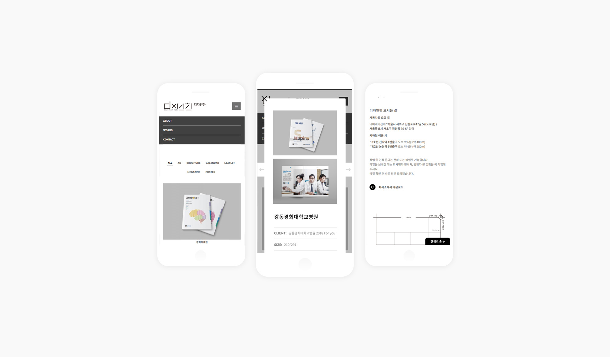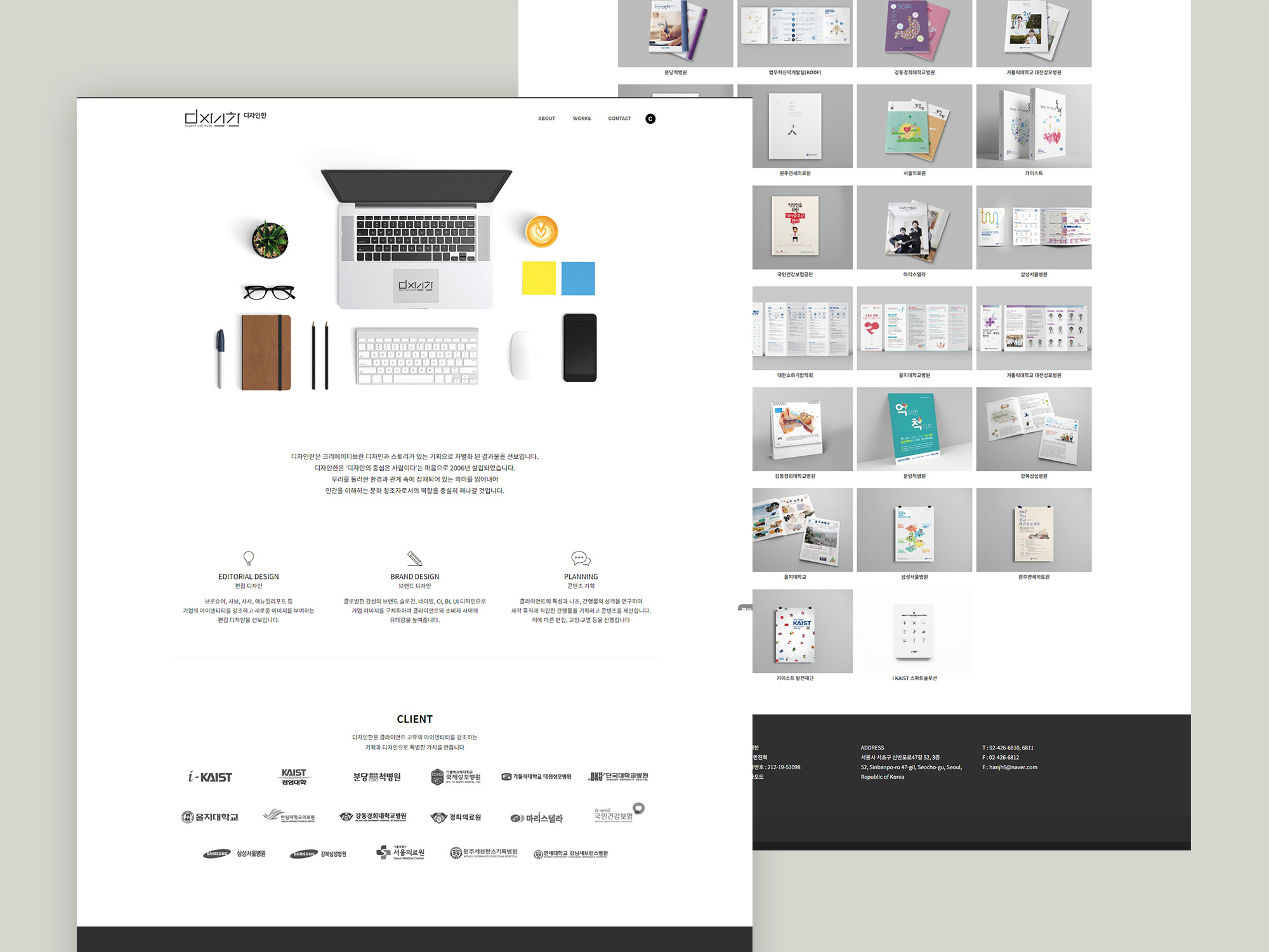 브로슈어, CI, BI 등의 디자인 전문기업 디자인한의 홈페이지를 제작했습니다. 클라이언트의 요청에 따라 포트폴리오를 우선으로한 고객의 접근 편의성, 심플하고 플랫한 디자인이 매력적인 반응형 홈페이지 입니다. PC는 물론 모바일 등의 다양한 웹환경에서도 최적화된 콘텐츠뷰를 위한 AJAX기반의 포트폴리오를 구축하였습니다.