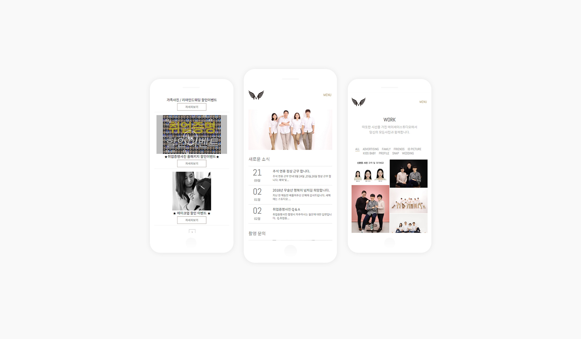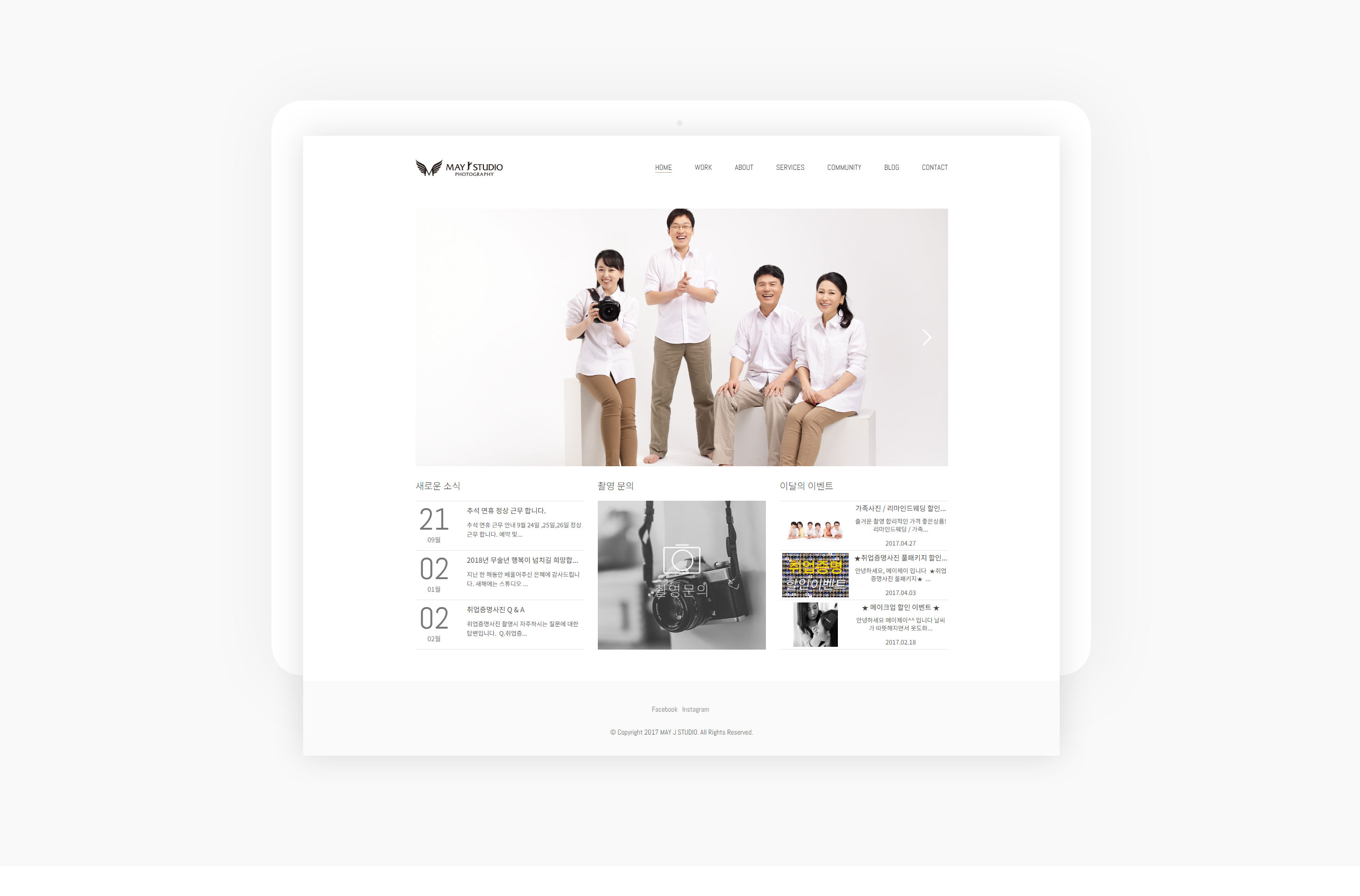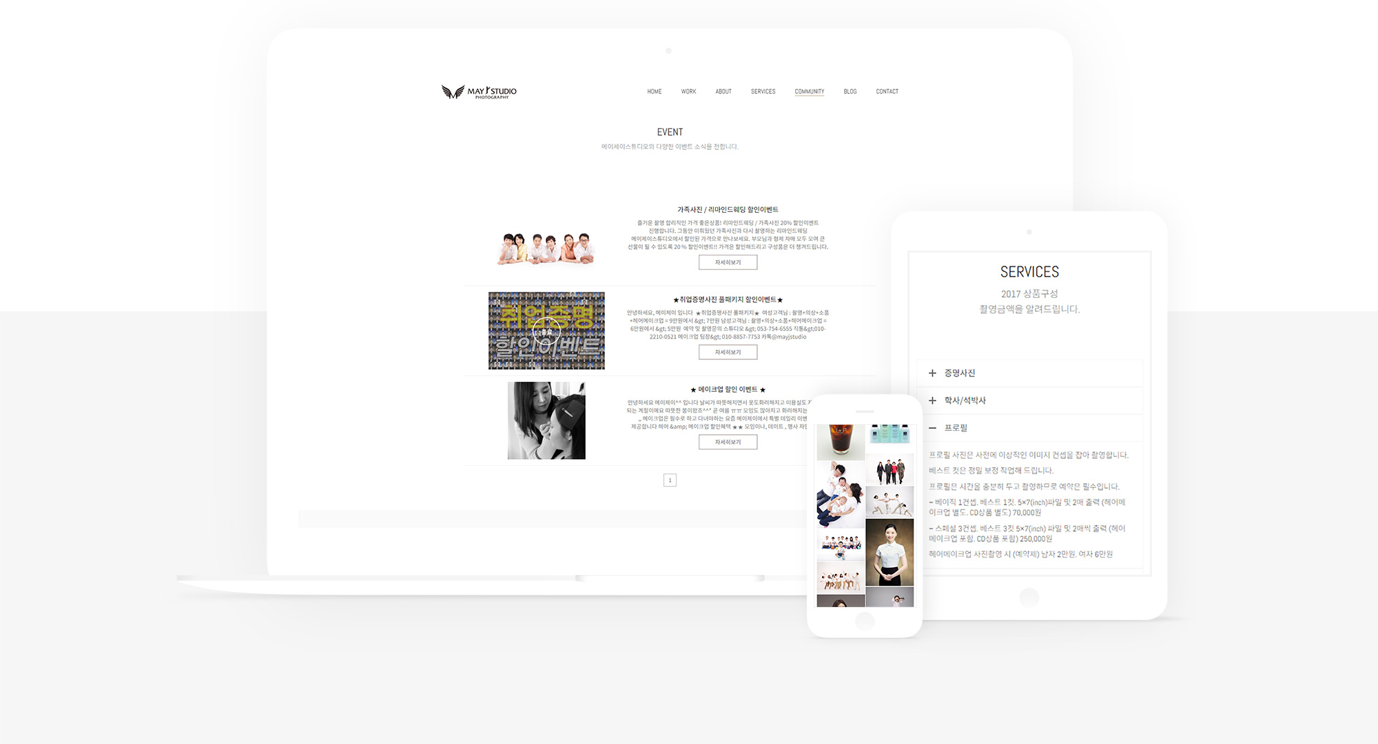 증명사진 부터 웨딩까지 다양한 포트폴리오와 감각적인 사진을 선사하는 메이제이스튜디오의 홈페이지를 구축했습니다. 100% 반응형웹 기반으로 고객 맞춤형 한국형 보드로 이벤트, 공지사항, Q&A 게시판을 구축하였고 라이트박스 기능의 포트폴리오 구성, 자체적으로 블로그를 운영할 수 있도록 구축되어진 스튜디오 홈페이지 입니다.