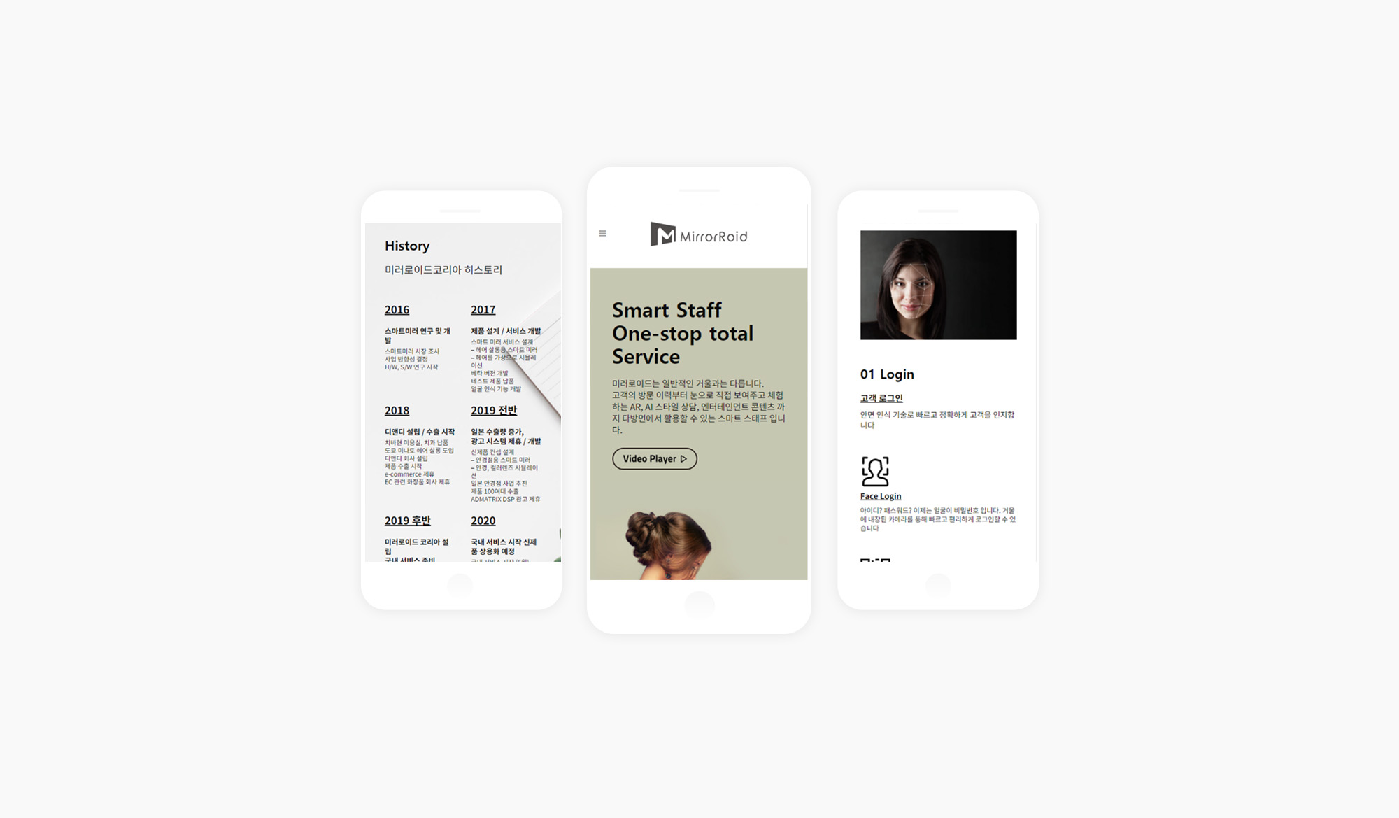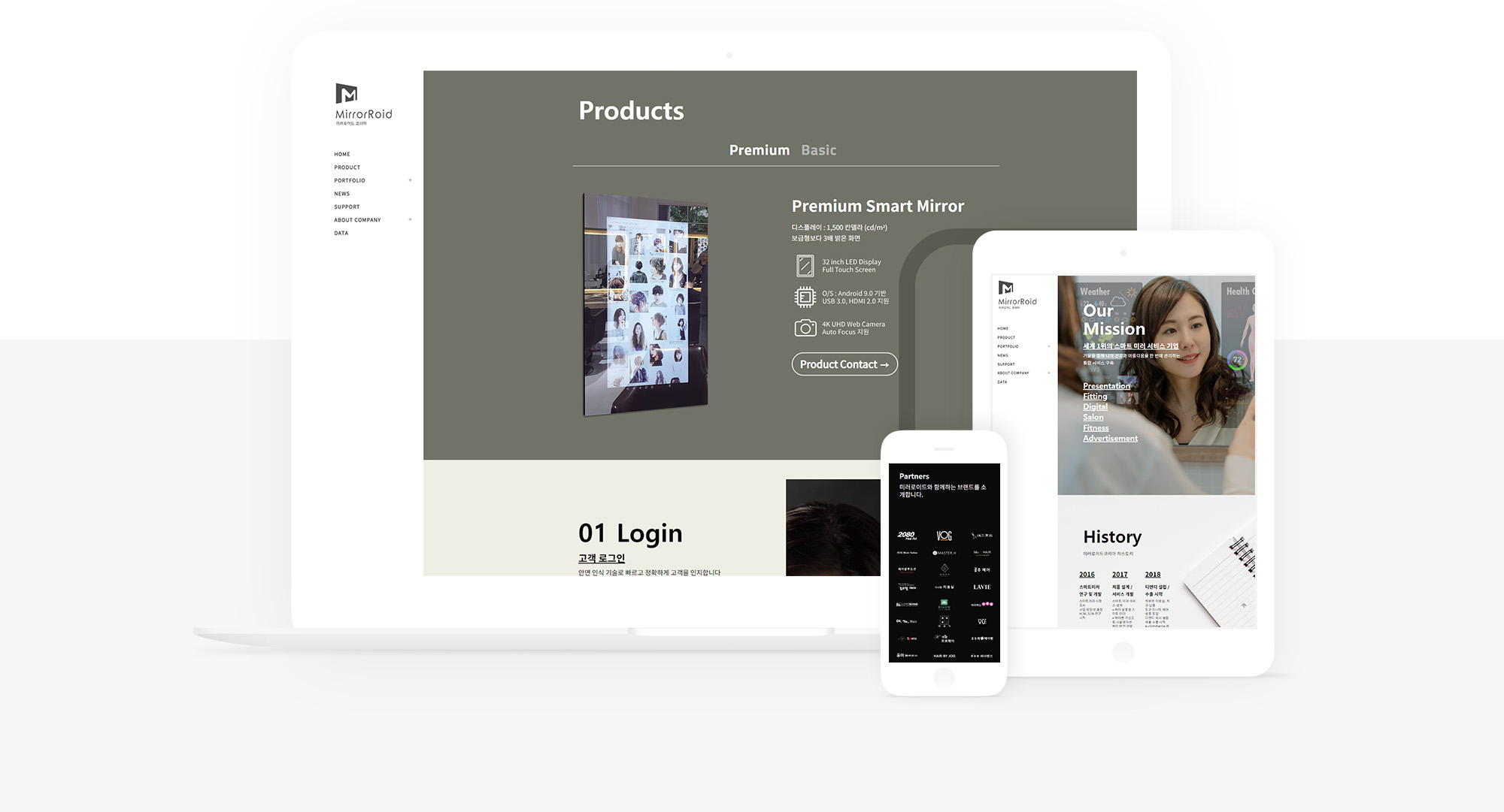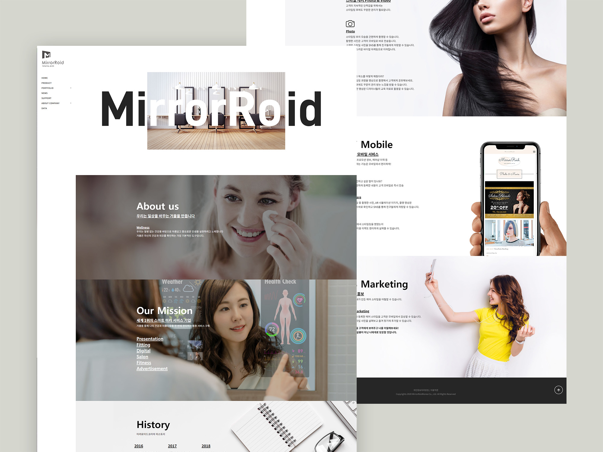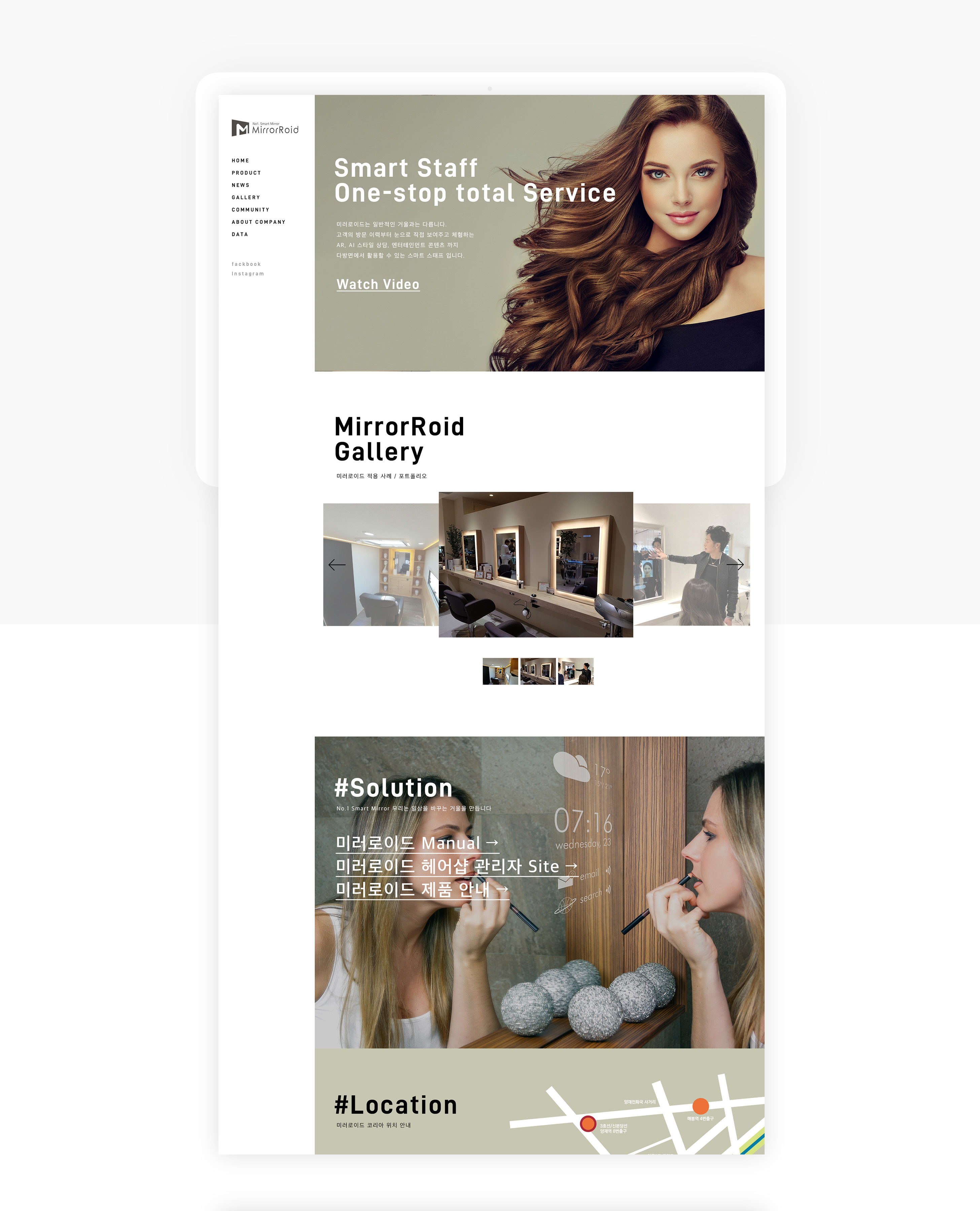 스마트미러 전문기업 미러로이드코리아의 홈페이지를 구축했습니다. 랜딩 전문기업 미러로이드코리아의 홈페이지를 구축했습니다. 랜딩형식의 사이트를 표방하여 PC와 모바일 모두 스크롤 만으로도 회사의 정보와 포트폴리오를 효과적으로 볼 수 있는 사이트 입니다.