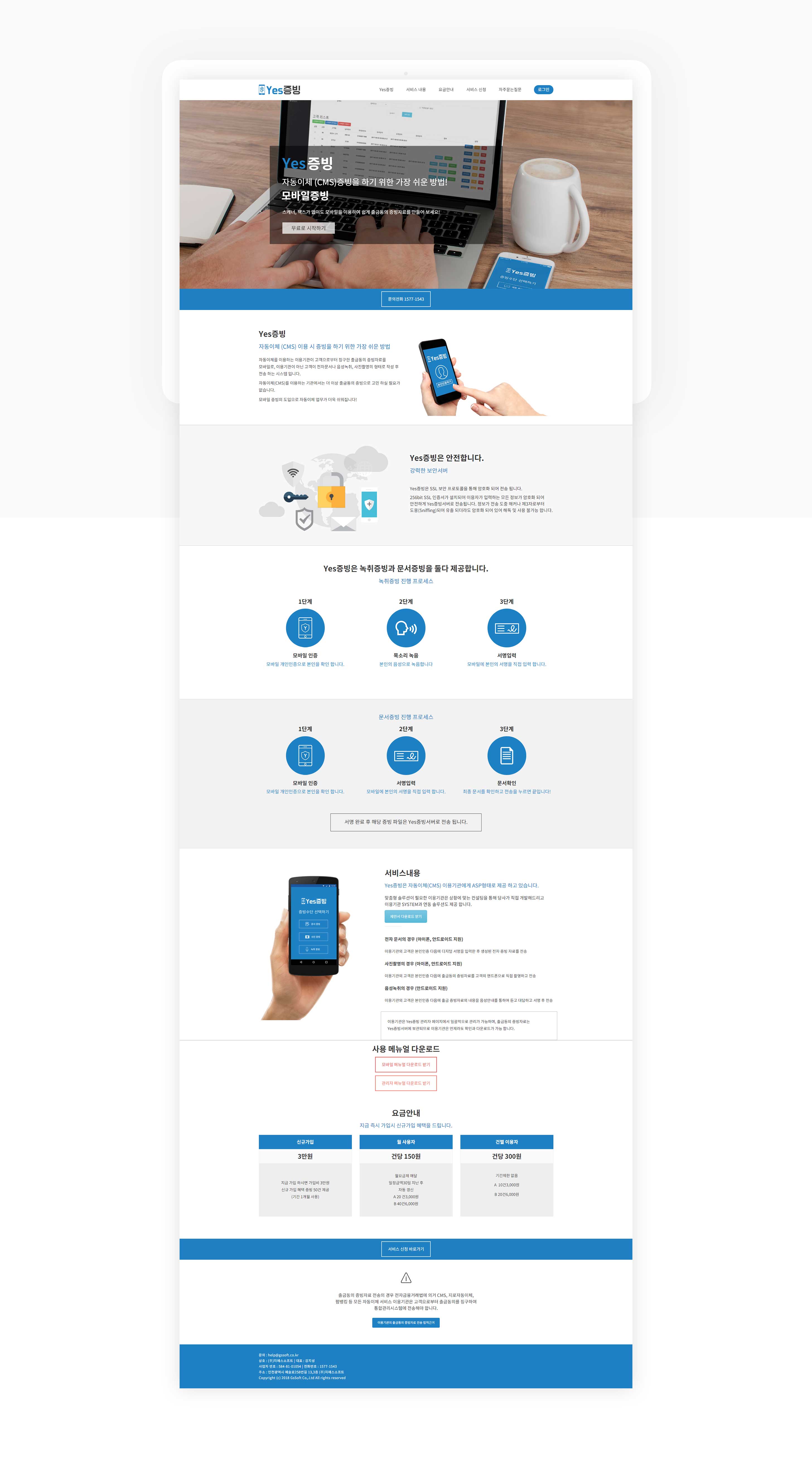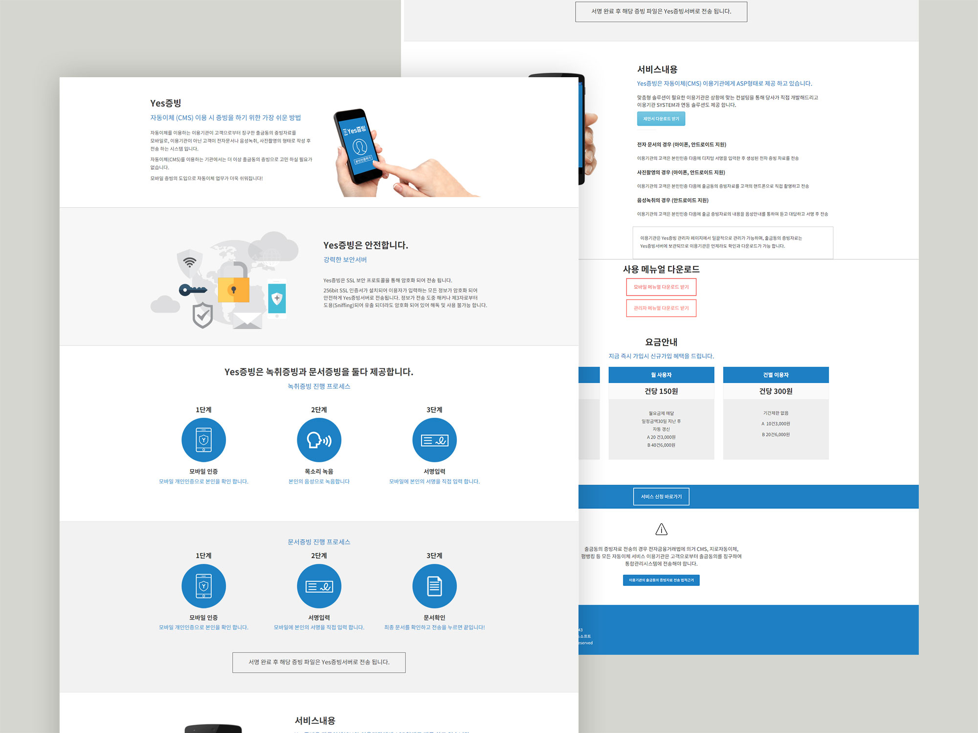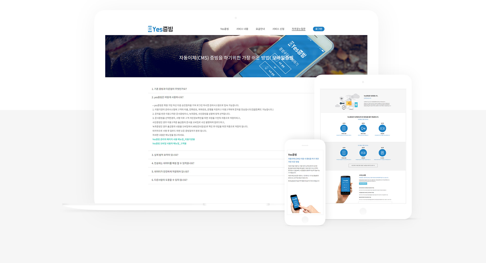 자동이체 CMS 증빙 솔루션 YES증빙의 원페이지 사이트를 제작했습니다. 직관적인 레이아웃 구성과 반응형웹으로 제작되어 모바일, 태블릿 환경에서도 최적화된 콘텐츠뷰를 구현합니다. 군더더기 없이 심플한 구성이 돋보이는 홈페이지 입니다.