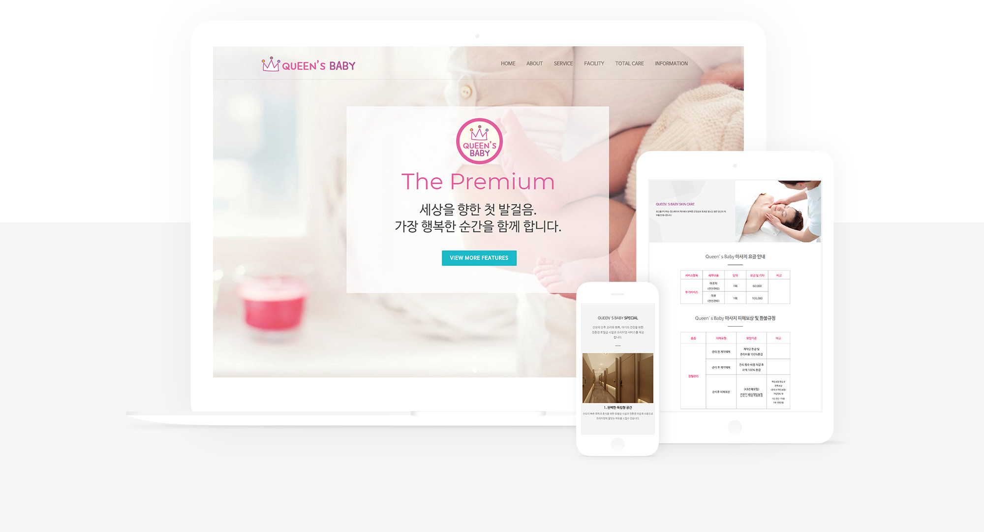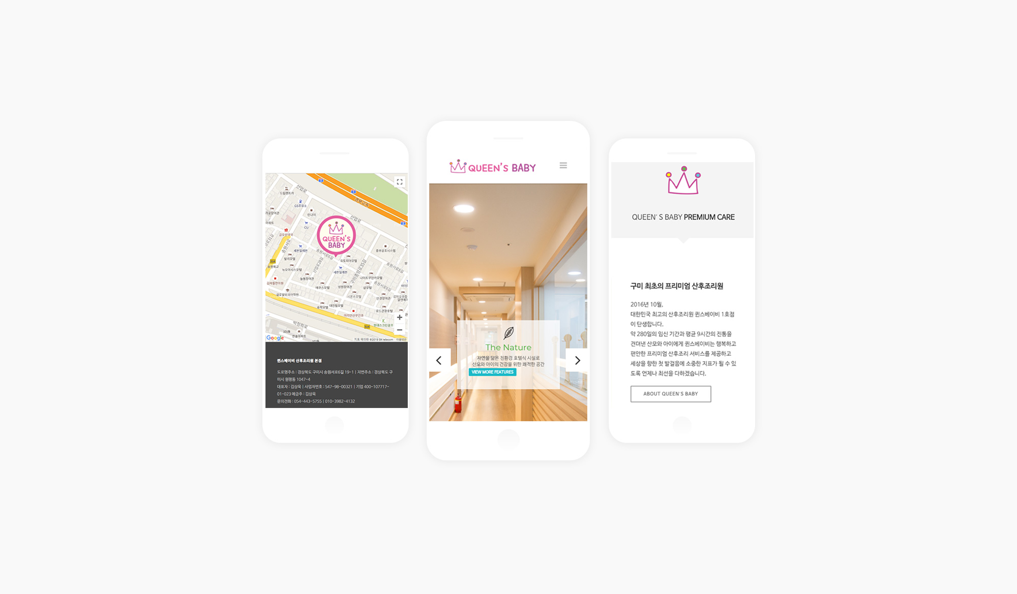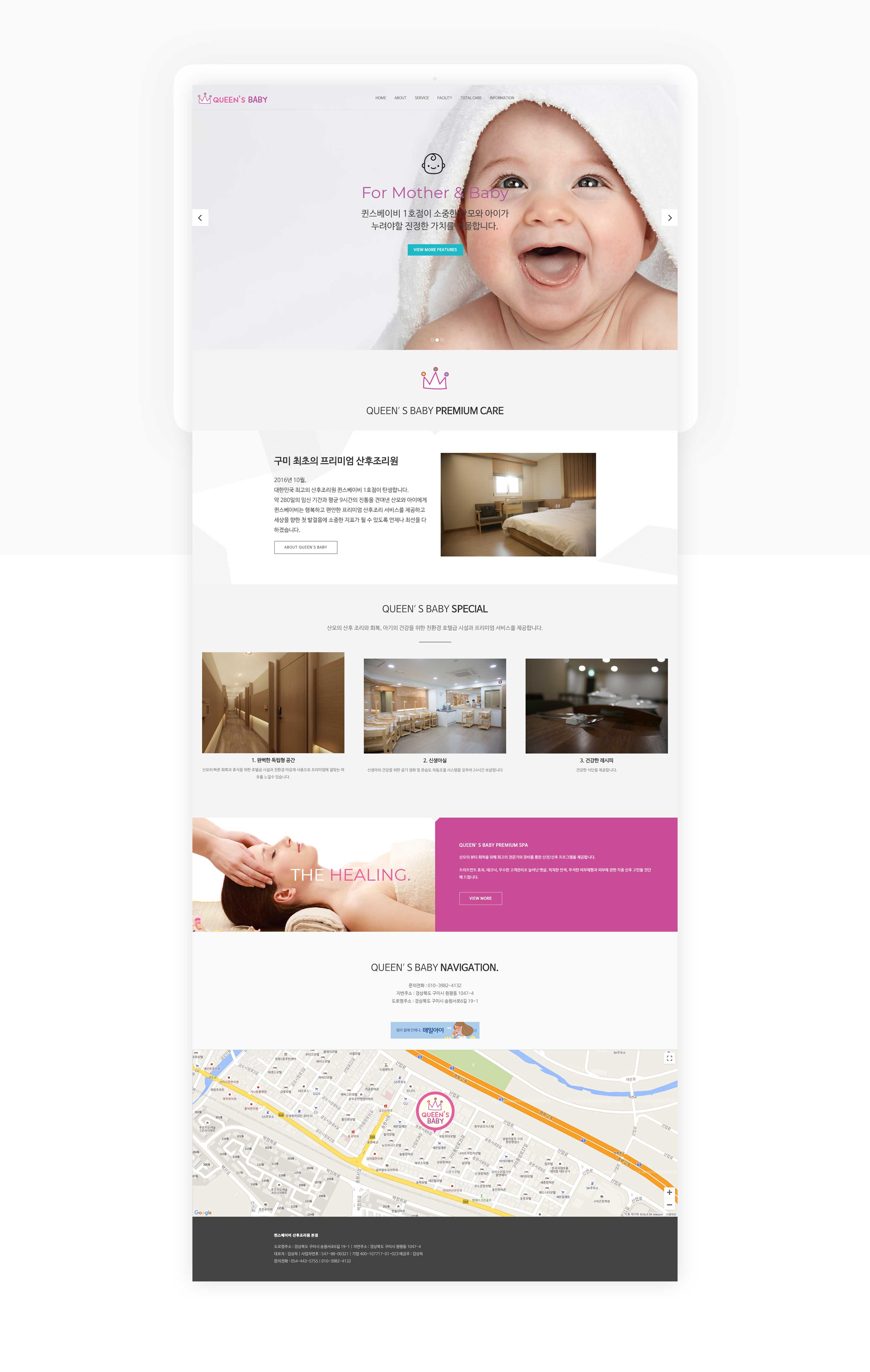 구미 프리미엄 산후조리원 퀸스베이비의 홈페이지를 구축했습니다. 풀페이지의 랜딩슬라이드 형식과 패럴럭스 효과의 조화, 로고와 브랜딩에 걸맞는 일러스트가 생기있게 느껴지는 홈페이지 입니다. 각 메뉴별로 산후조리원 고유의 특징과 기능들이 리딩하기 쉽도록 배치되어 고객들에게 효과적으로 전달될 수 있도록 제작되었습니다.
