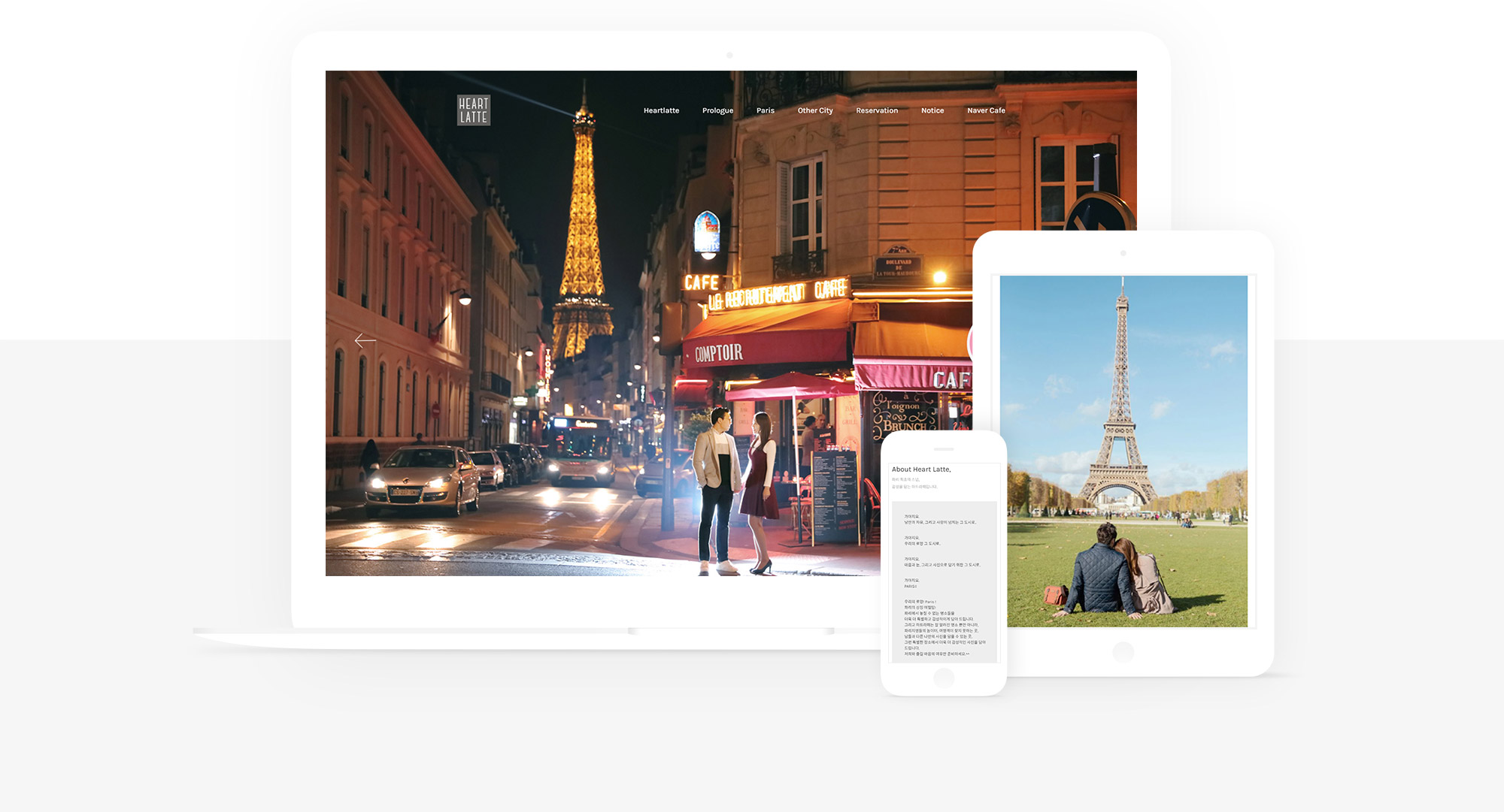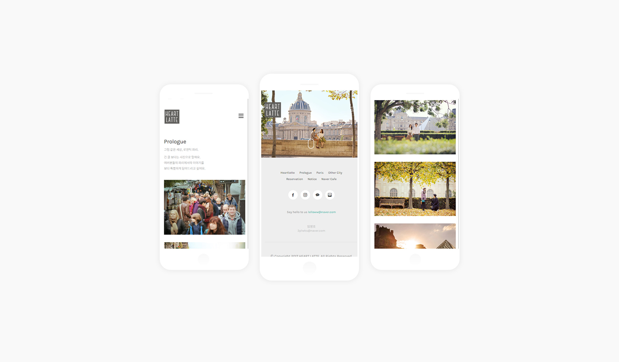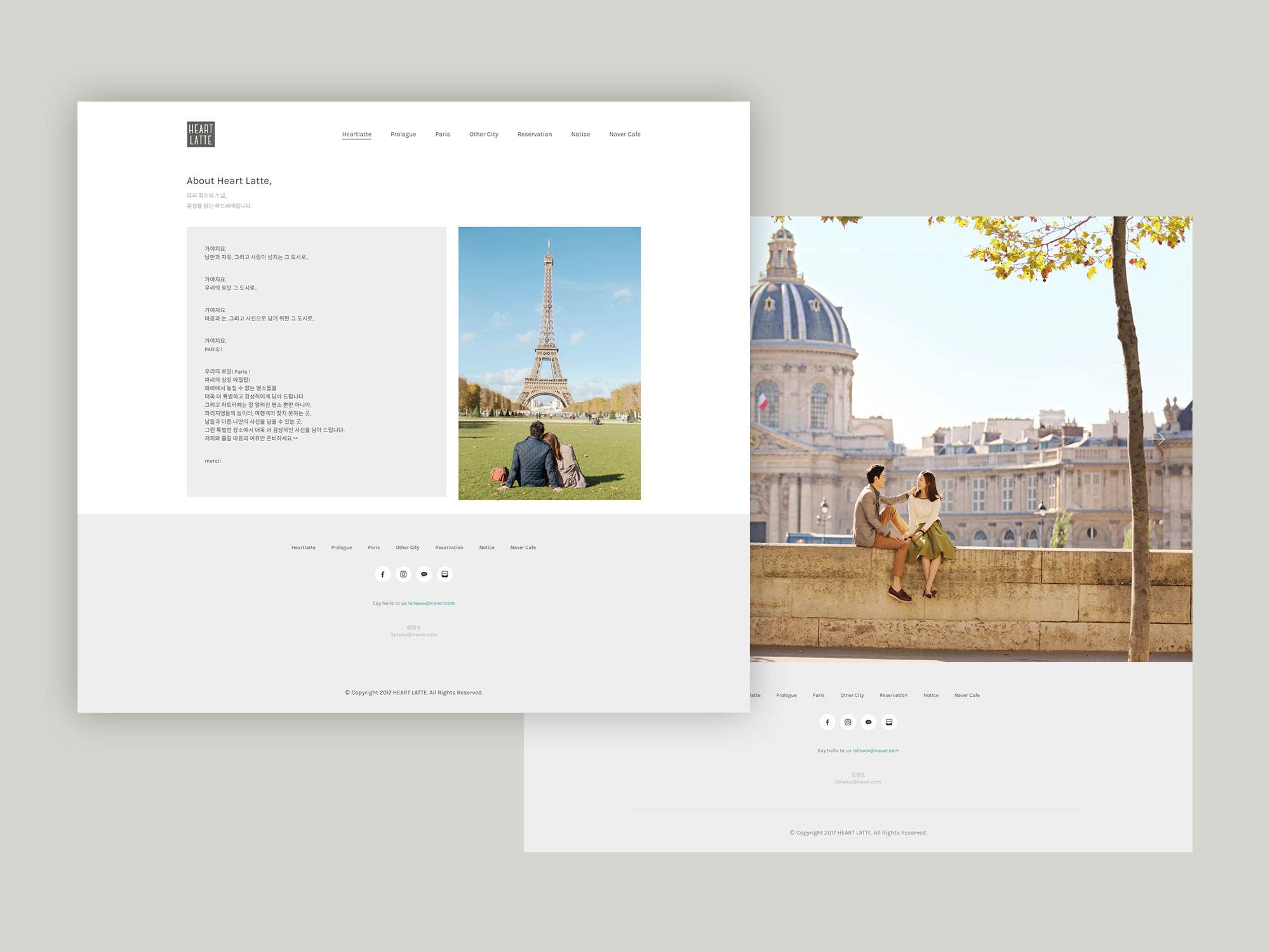 프랑스 파리 스냅 전문 하트라떼의 홈페이지를 제작했습니다. 웨딩, 데이트 스냅 등을 전문으로 하는 스튜디오 답게 감성적인 포인트와 직관적인 메뉴 구성, 페이드 효과, 사진의 톤을 살린 컬러 구성 등이 어울어져 완성도 있게 제작된 홈페이지 입니다.