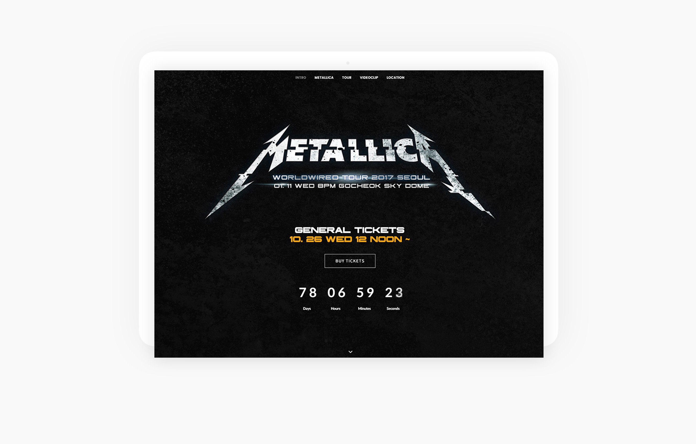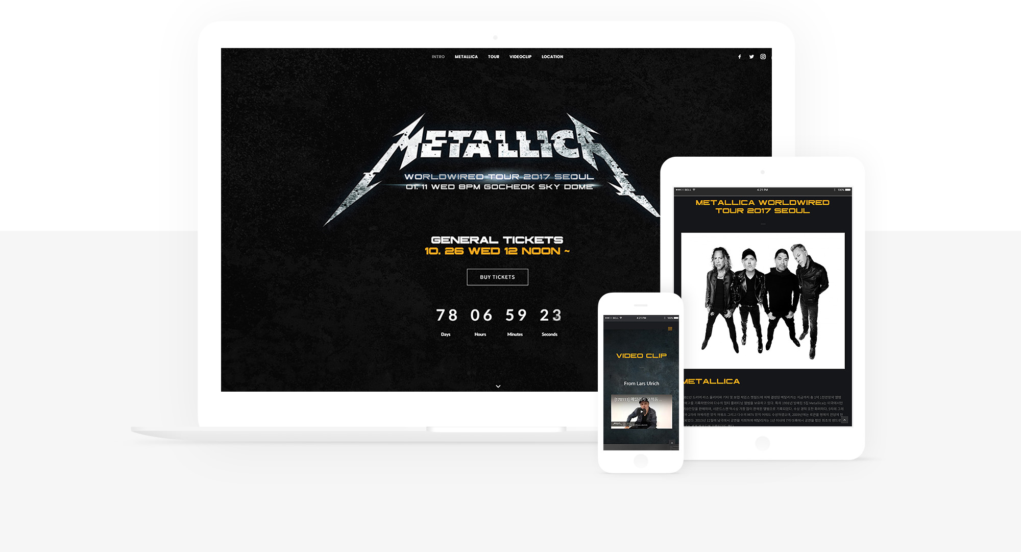 2017년 메탈리카의 내한공연 랜딩페이지를 제작했습니다. 메탈리카의 아이덴티티를 살린 백그라운드 이미지 처리와 절제된 이펙트효과, 우측 스위치바를 통한 페이지 이동, 소셜 연동 등이 어울어져 심플하지만 전달하고자 하는 컨텐츠 들을 임팩트있게 포지셔닝 할 수 있는 반응형 기반의 공연 홈페이지 입니다.